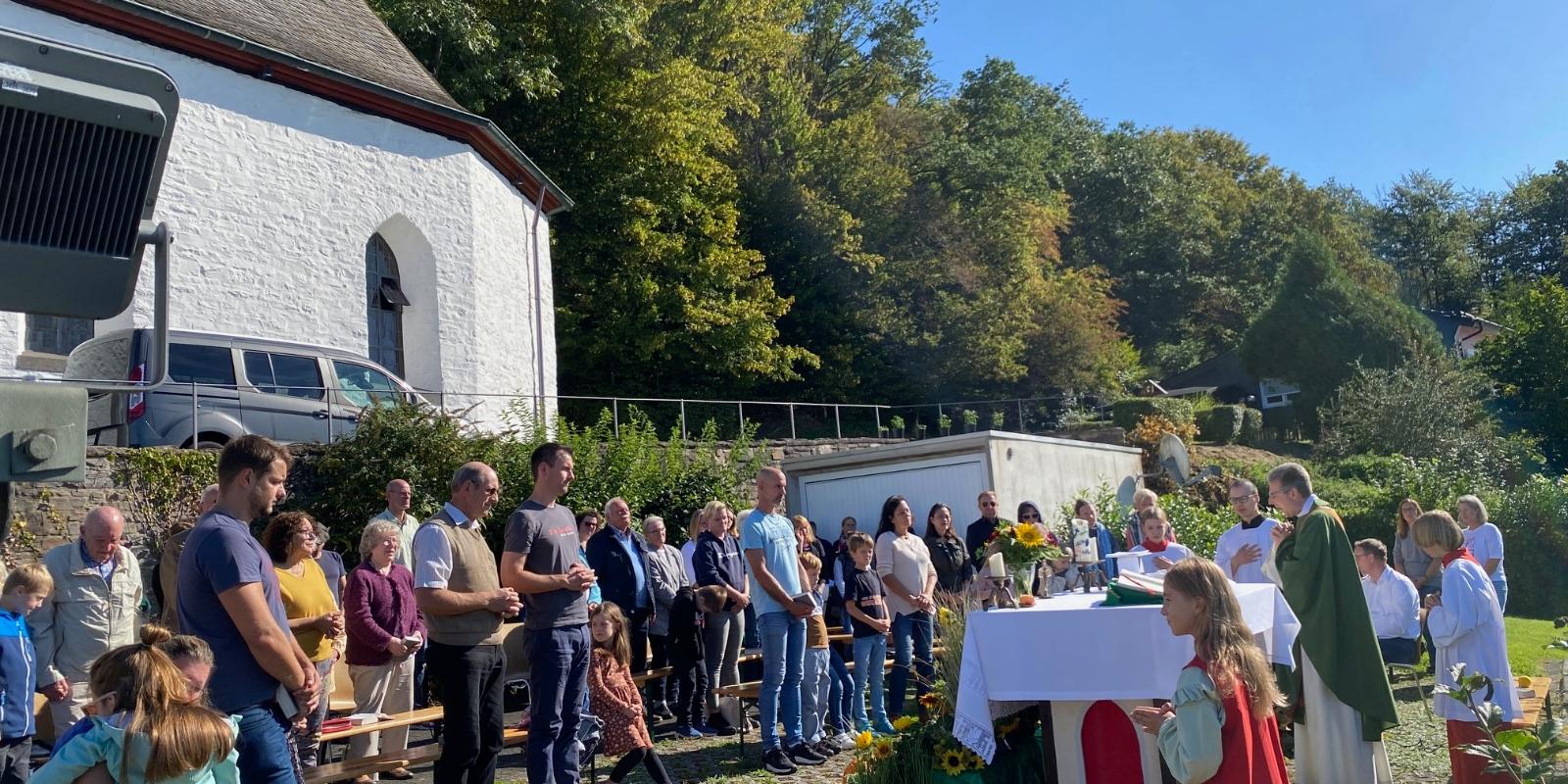 Am Sonntag, 24.09. sind morgens die Helfer zusammen gekommen, um das Kapellenfest in gewohnter Weise auf der Wiese hinter der Kapelle in Rosbach aufzubauen. Jedoch hatten wir an diesem Tage einen so intensiven Morgentau, der bis zum Gottesdienst um 11:00 Uhr nicht verflogen wäre, jedoch keiner nasse Füße bekommen sollte. Aus diesem Grunde haben die Helfer kurzerhand entschieden, die Messe als Premiere auf dem Parkplatz unterhalb der Kapelle mit tollem Blick über Rosbach auszurichten.